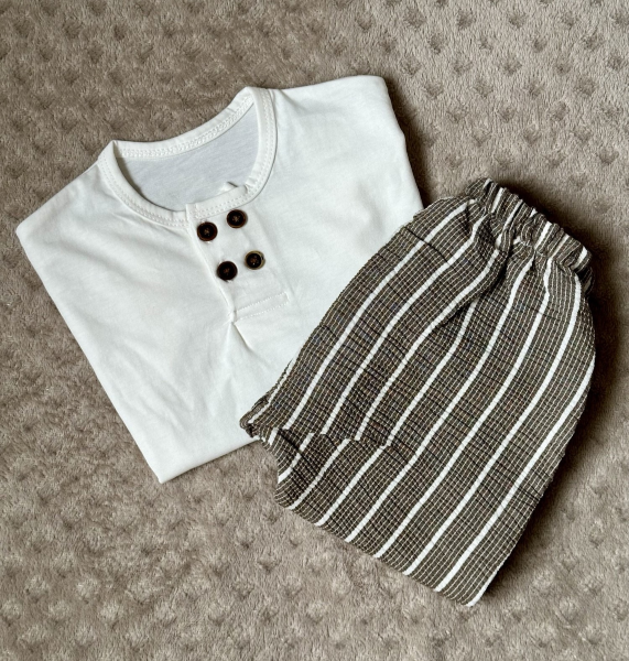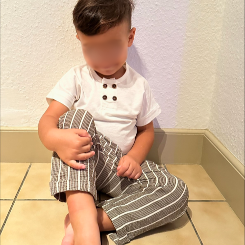 Le pantalon assorti complète parfaitement l'ensemble avec sa coupe moderne et décontractée. Conçu également en coton 100%, il offre une sensation douce et respirante, parfaite pour les journées chaudes comme pour les moments de détente. La taille élastiquée assure un ajustement confortable et s’adapte facilement à la morphologie de l’enfant, facilitant l'habillage et le déshabillage. Le pantalon est doté de poches latérales pratiques pour ranger les petits trésors, et ses coutures solides garantissent une excellente résistance, même lors des jeux les plus actifs.