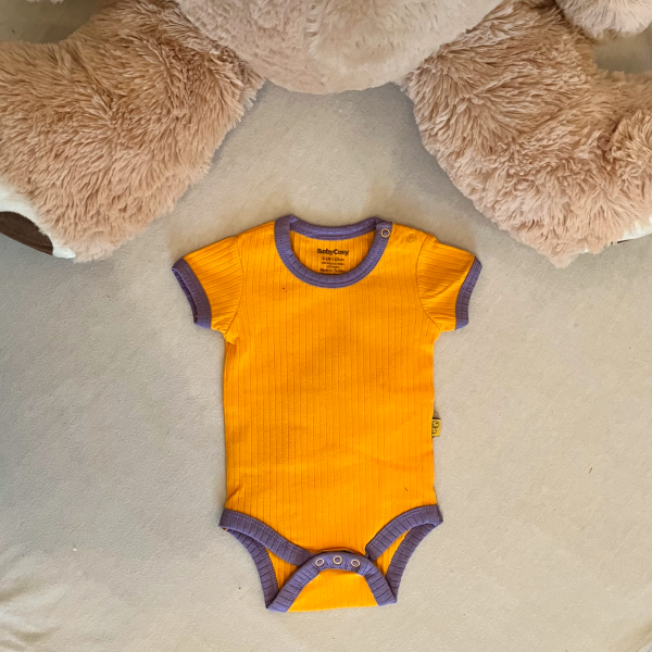 Le second body, d'un jaune éclatant, évoque la chaleur et la joie. Cette couleur vive et ensoleillée est parfaite pour les journées estivales, ajoutant une touche de gaieté aux tenues de votre bébé. L'encolure américaine, également appelée encolure enveloppe, permet un passage facile de la tête, rendant l'habillage encore plus pratique. Comme le body violet, il est doté de boutons-pression à l'entrejambe, assurant un changement de couche simple et rapide.