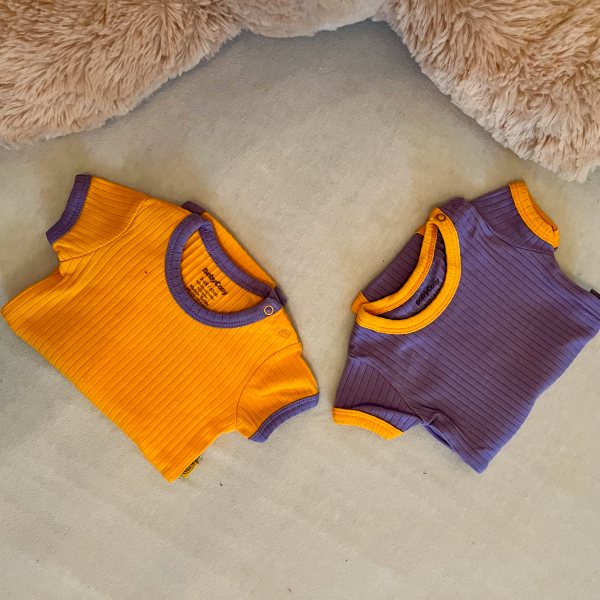 Optez pour ce lot de 2 bodies manches courtes violet et jaune 100% coton, et offrez à votre bébé des vêtements de qualité qui allient fonctionnalité, confort et style. Ces bodies deviendront rapidement des incontournables de la garde-robe de votre enfant, adaptés à toutes les occasions et à toutes les saisons.